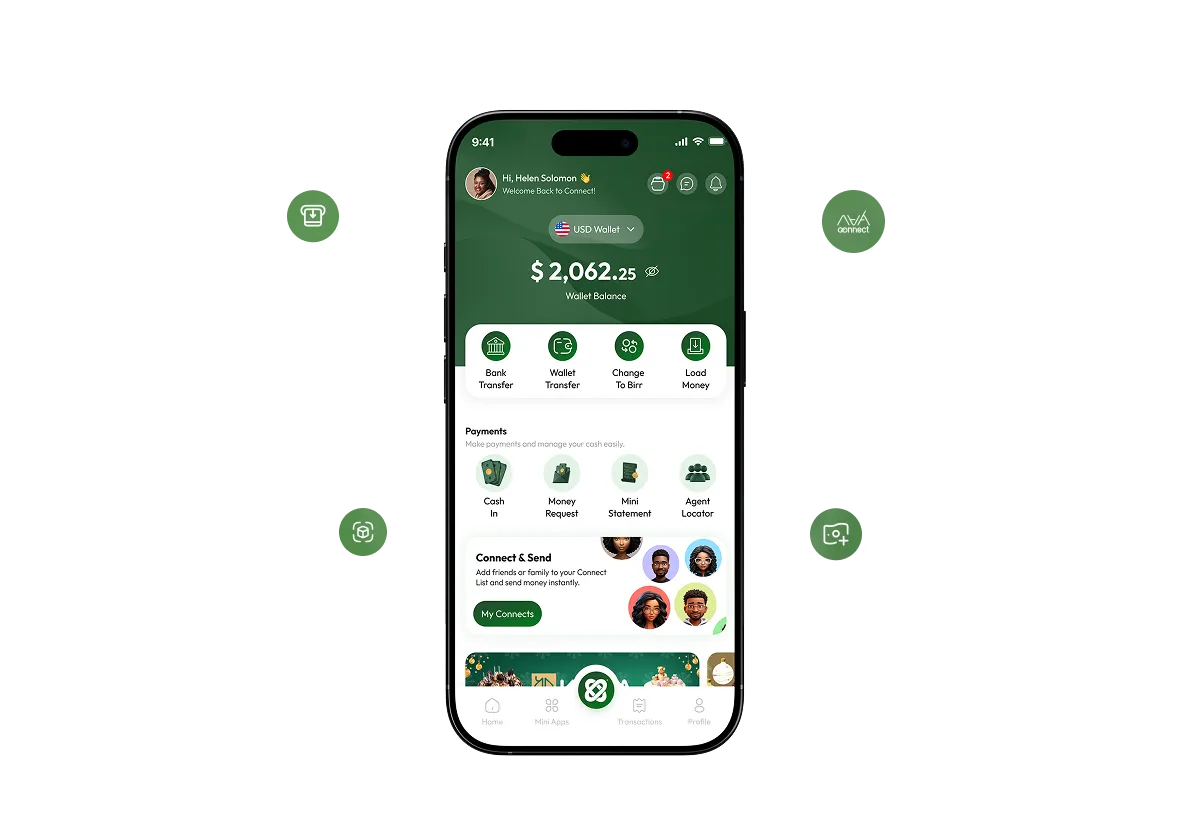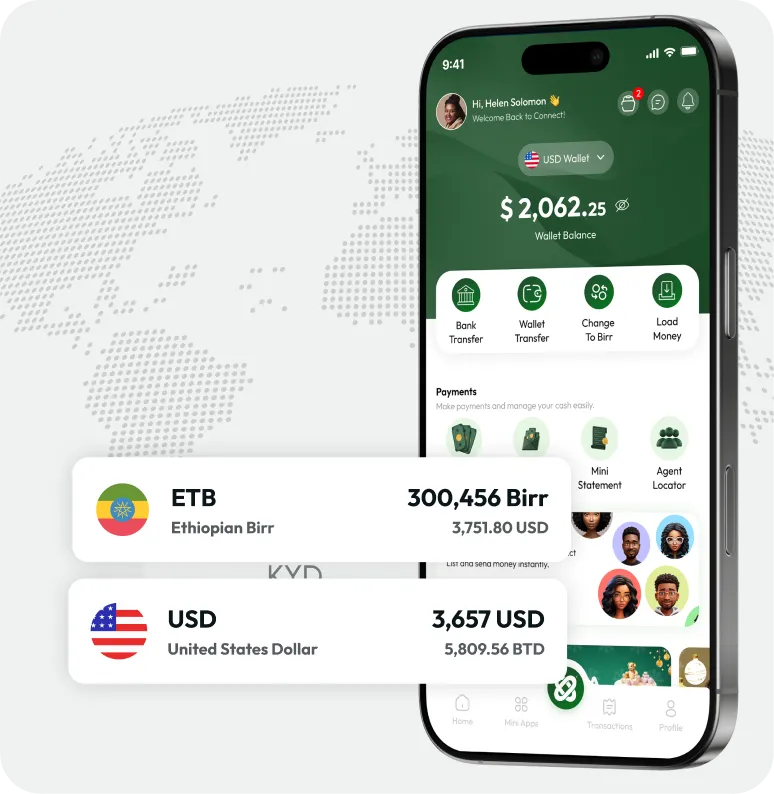 Send money locally or across borders in seconds. Connect makes it effortless to transfer funds in either Ethiopian Birr or US Dollars with real-time currency conversion and direct transfers to wallets or bank accounts.