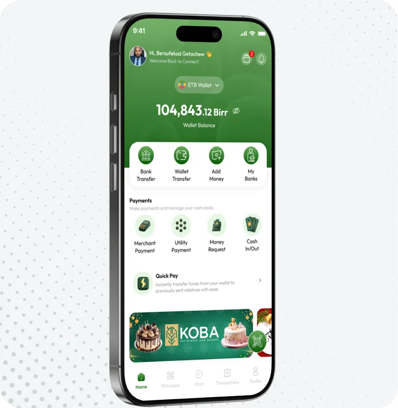 Transfer funds directly to other Connect users instantly, or send money to any bank account in Ethiopia. Whether it’s for family, business, or savings, Connect makes moving money simple and reliable.